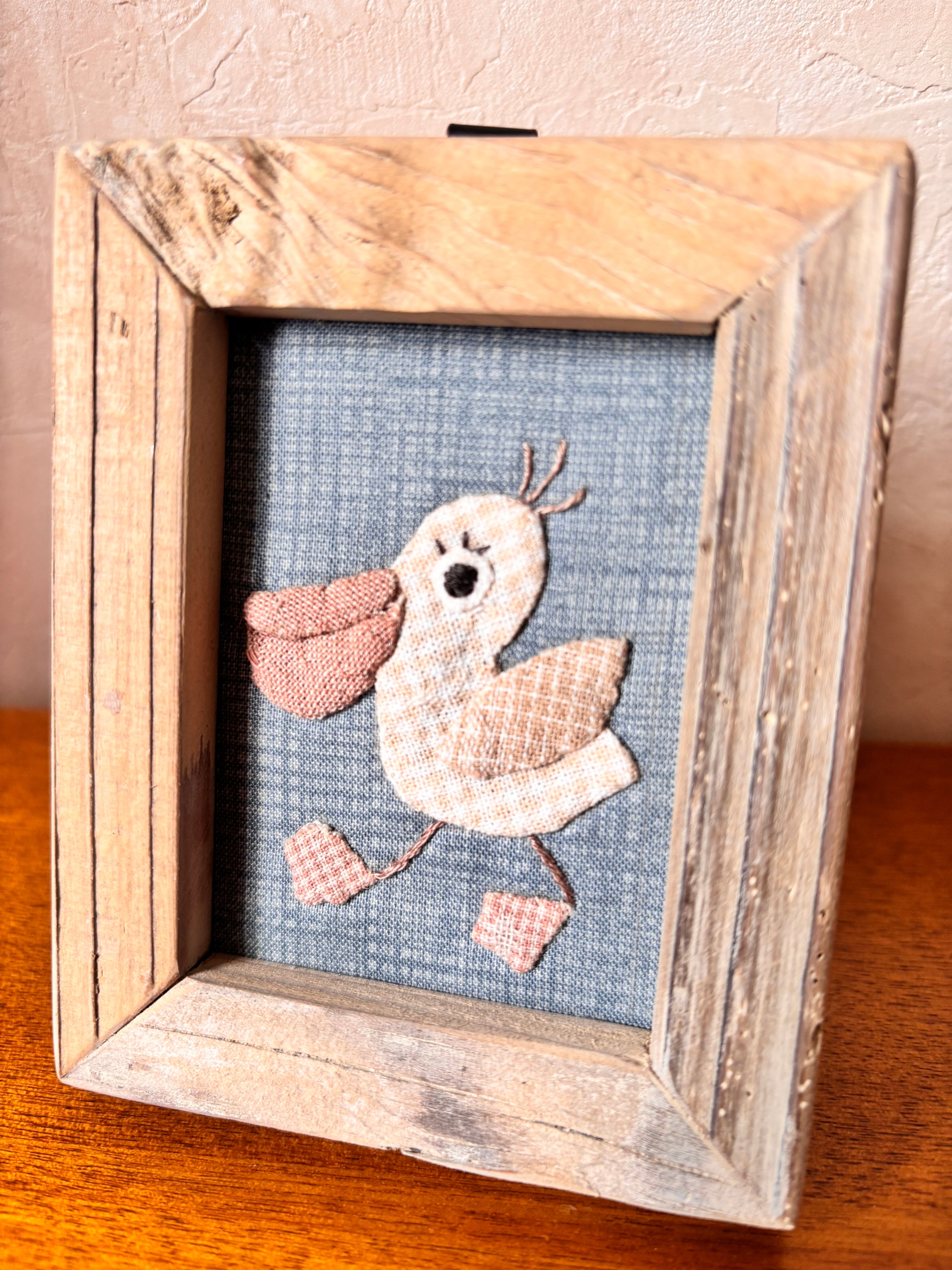 ペリカンという個性のある鳥をバンドアップリケでコミカルに仕上げました。独特の存在感と